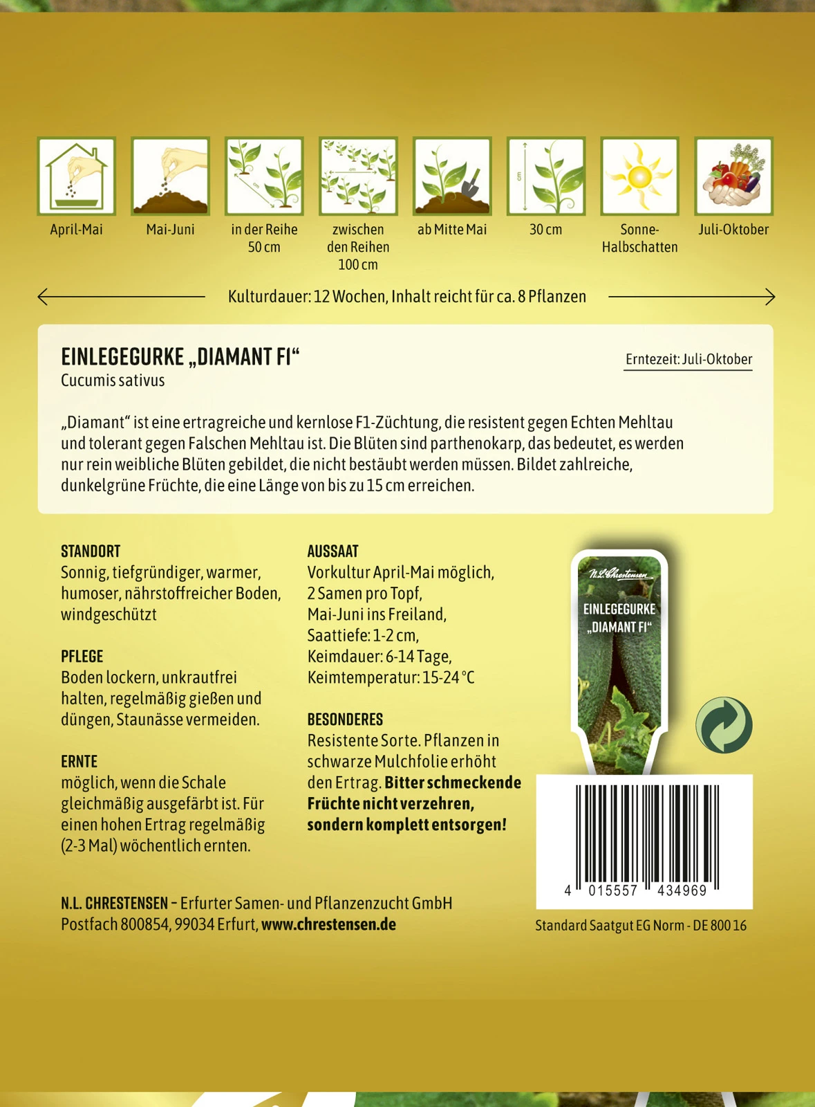 „Diamant“ ist eine ertragreiche und kernlose F1-Züchtung, die resistent gegen Echten Mehltau und tolerant gegen Falschen Mehltau ist. Die Blüten sind parthenokarp, das bedeutet, es werden nur rein weibliche Blüten gebildet, die nicht bestäubt werden müssen. Bildet zahlreiche, dunkelgrüne Früchte, die eine Länge von bis zu 15 cm erreichen.