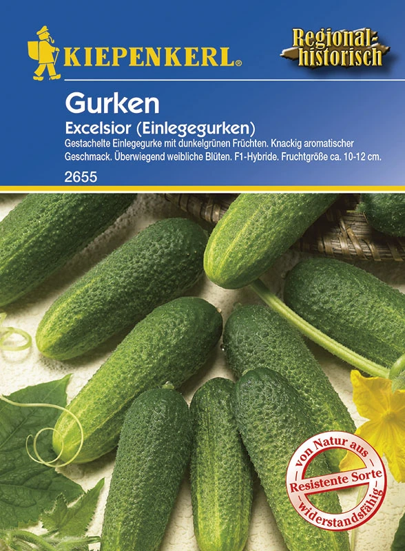 Mittelfrühe, gestachelte Einlegegurke in bester, knackiger Fruchtqualität. Sehr ertragreich und bitterfrei. Überwiegend weibliche Blüten.