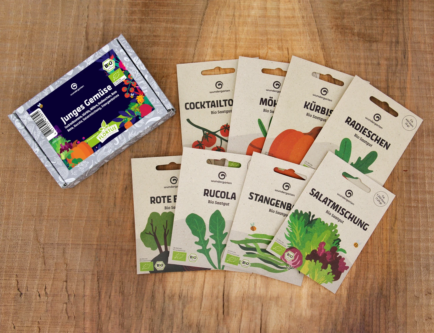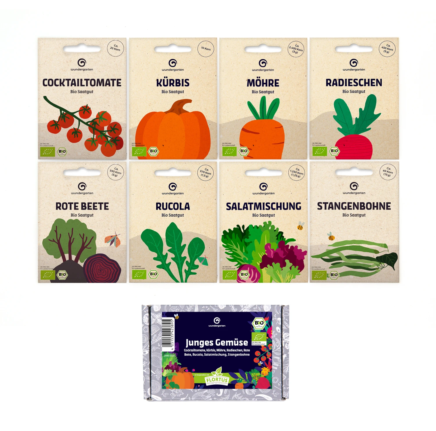 Das Set „Junges Gemüse“ ist ein kleines Potpourri quer durchs Gemüsebeet. Cocktailtomaten werden ergänzt von Rucola und einer Salatmischung, zu Kürbis und Stangenbohnen gesellen sich Rote Beete und Radieschen. Von vielen Gemüsesorten aus dem Set können Sie nicht nur die Früchte essen, sondern auch das junge Grün. Mit dem jungen Gemüse lassen sich nicht nur Salate zubereiten, sondern auch zahlreiche Rezepte. Frisch aus dem Garten, von Terrasse oder Balkon schmeckt das Gemüse aber am besten.