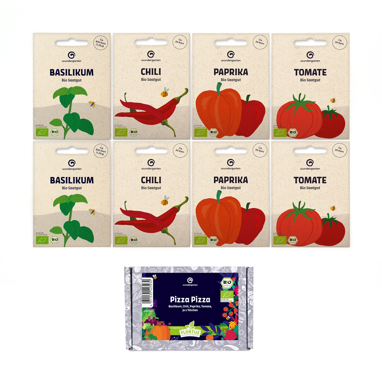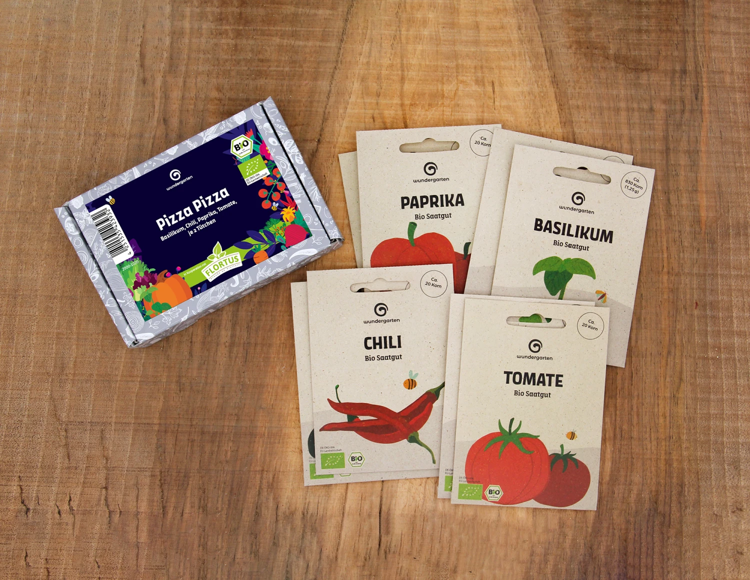 Nichts geht über eine Pizza, die selbst gemacht ist. Mit duftendem Teig, etwas Salami oder Schinken und ganz viel frischem Gemüse aus dem eigenen Anbau schmeckt die Pizza besonders lecker. Mit dem Pizza Pizza Set erhalten Sie Gemüse- und Kräutersaatgut, das auf einer Pizza unbedingt benötigt wird. Paprika und Tomaten, Basilikum und Chili – mehr braucht eine gute Pizza fast nicht. Ziehen Sie Chili, Tomaten und Paprika rechtzeitig auf der Fensterbank vor. Nach den Eisheiligen können die Pflanzen ins Freie. Sie können die Pflanzen in den Garten setzen oder im Pflanzkübel auf Balkon und Terrasse kultivieren.