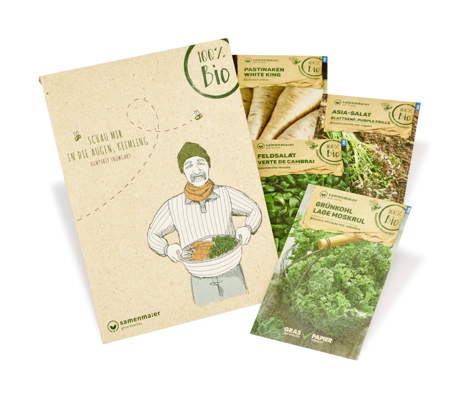 Schau mir in die Augen, Keimling! Wenn es um winterfesten Anbau von Gemüse geht, kann keiner unserem Bio Wintergarten Set „Humphrey Snowgart“ etwas vormachen. Nicht einmal der Winter selbst. Dafür sorgen die 4 Eisheiligen im Set: Der ertragreiche und schmackhafte Bio Grünkohl Lage Moskrul, der pfeffrig-pfiffige Bio Asia-Salat Blattsenf (Purple Frills), der kräftige Winterkönig Bio Pastinake White King sowie der schnellwüchsige, nussige Bio Feldsalat Verte de Cambrai. Also: Bleib Kohl – dank dem Bio Wintergarten Set Humphrey Snowgart von Samen Maier.